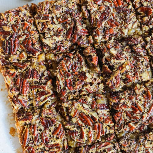 - Make the pie bars ahead of time – Get ahead with baking and simply prepare these pecan bars a couple of days before you’re ready to serve them. That way they’re ready to go whenever you need them! You can also freeze them for a couple of months to get way ahead on dessert prep.