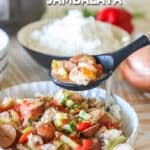 - Prep in advance – This recipe is one giant short cut from the traditional stove top recipe. The only thing that would make this easier at cook time is if you pre-cut your chicken thighs and slice your sausage in advance. You could go ahead and mix all of the ingredients together in a bowl and set it in the fridge until you’re ready to place it all into the crockpot for cooking.