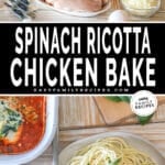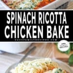 Two photos of spinach ricotta chicken bake, one in a baking dish with one served on a plate with noodles.